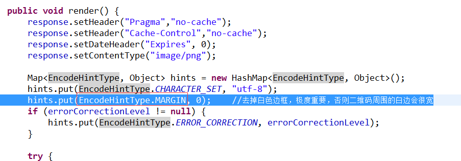 2017-04-16 07:38:13 [WARN]-[Thread: qtp1754024567-26]-[org.eclipse.jetty.servlet.ServletHandler.doHandle()]: Error for /pay/test java.lang.NoSuchFieldError: MARGIN at com.jfinal.render.QrCodeRender.render(QrCodeRender.java:93) at com.jfinal.core.ActionHandler.handle(ActionHandler.java:99) at Xss.XssHandler.handle(XssHandler.java:26) at config.GlobalHandler.handle(GlobalHandler.java:51) at com.jfinal.core.JFinalFilter.doFilter(JFinalFilter.java:74) at org.eclipse.jetty.servlet.ServletHandler$CachedChain.doFilter(ServletHandler.java:1307) at org.eclipse.jetty.servlet.ServletHandler.doHandle(ServletHandler.java:453) at org.eclipse.jetty.server.handler.ScopedHandler.handle(ScopedHandler.java:137) at org.eclipse.jetty.security.SecurityHandler.handle(SecurityHandler.java:560) at org.eclipse.jetty.server.session.SessionHandler.doHandle(SessionHandler.java:231) at org.eclipse.jetty.server.handler.ContextHandler.doHandle(ContextHandler.java:1072) at org.eclipse.jetty.servlet.ServletHandler.doScope(ServletHandler.java:382) at org.eclipse.jetty.server.session.SessionHandler.doScope(SessionHandler.java:193) at org.eclipse.jetty.server.handler.ContextHandler.doScope(ContextHandler.java:1006) at org.eclipse.jetty.server.handler.ScopedHandler.handle(ScopedHandler.java:135) at org.eclipse.jetty.server.handler.HandlerWrapper.handle(HandlerWrapper.java:116) at org.eclipse.jetty.server.Server.handle(Server.java:365) at org.eclipse.jetty.server.AbstractHttpConnection.handleRequest(AbstractHttpConnection.java:485) at org.eclipse.jetty.server.AbstractHttpConnection.headerComplete(AbstractHttpConnection.java:926) at org.eclipse.jetty.server.AbstractHttpConnection$RequestHandler.headerComplete(AbstractHttpConnection.java:988) at org.eclipse.jetty.http.HttpParser.parseNext(HttpParser.java:635) at org.eclipse.jetty.http.HttpParser.parseAvailable(HttpParser.java:235) at org.eclipse.jetty.server.AsyncHttpConnection.handle(AsyncHttpConnection.java:82) at org.eclipse.jetty.io.nio.SelectChannelEndPoint.handle(SelectChannelEndPoint.java:628) at org.eclipse.jetty.io.nio.SelectChannelEndPoint$1.run(SelectChannelEndPoint.java:52) at org.eclipse.jetty.util.thread.QueuedThreadPool.runJob(QueuedThreadPool.java:608) at org.eclipse.jetty.util.thread.QueuedThreadPool$3.run(QueuedThreadPool.java:543) at java.lang.Thread.run(Thread.java:619)