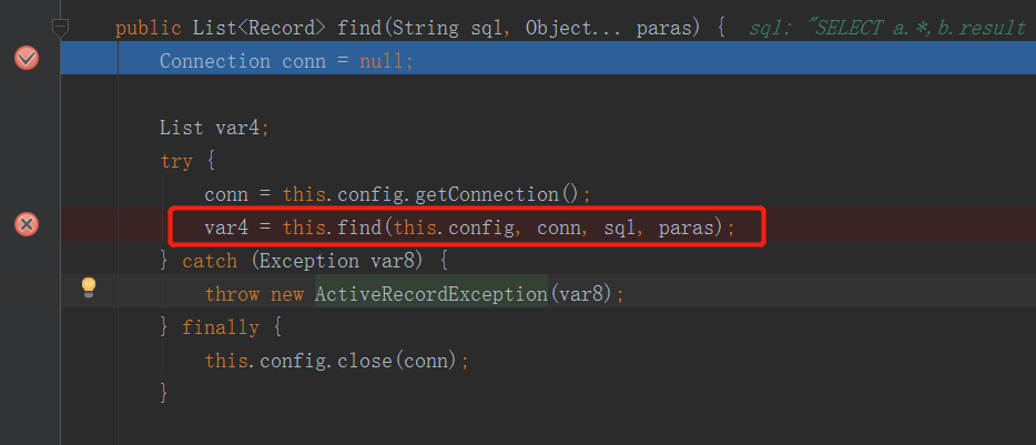 调试断点的时候出现 conn = this.config.getConnection();语句走完以后,直接return了 ,没有执行var4 = this.find(this.config, conn, sql, paras);语句,不知道是什么原因