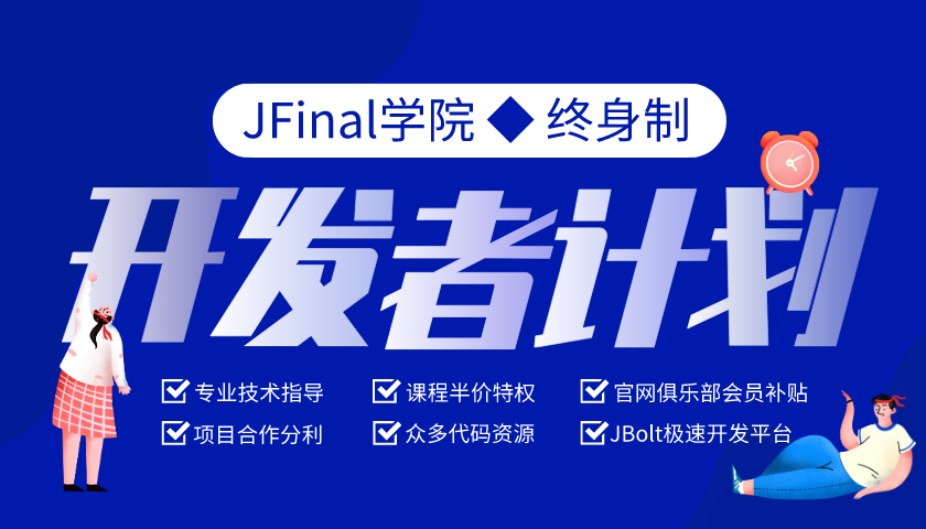 JFinal研修院商业开发者计划,让你高效学习JFinal、使用JFinal最佳实践、利用JBolt极速开发平台为个人和企业降本增效。