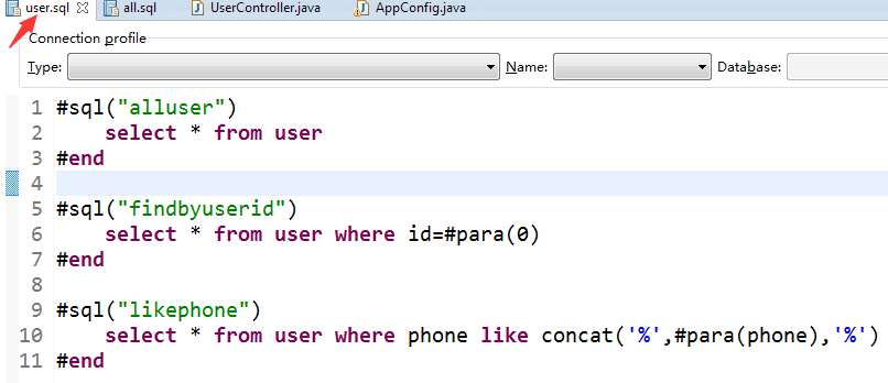 注:补充一点 , 在#sql("alluser")与#end之间可以加上 #if(username) and username=#para(username) #end